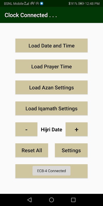 You can use "e-CAP Software USB" for configuring e-CAP Prayer time Displays having USB connectivity. You can configure time, date(Georgian and Hijri), prayer time calendar from the application database, automatic/manual modes of Bank and Iqamath times, notification sounds, etc. For connecting you need a phone having OS version KitKat or above and a data cable(available with the phone charger).