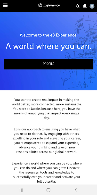 The e3 Experience app is Jacobs' unique approach that ensures every employee can engage with and celebrate others, excel in their role, elevate their career and empower employees and leaders alike to discover the incredible capabilities across our collective global network. By amplifying the strength of each of our employees and their career aspirations, the way we impact the world to make it more connected and sustainable is expanded.