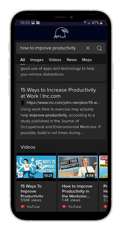 Eagle Browser helps you browse much faster with most secure search engine "DuckDuckGo". Throughout the time