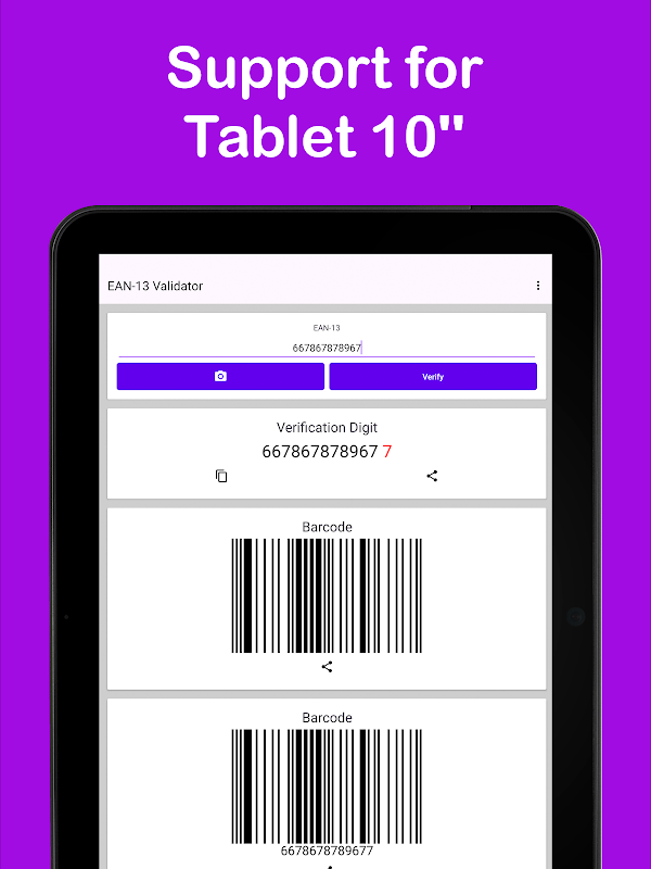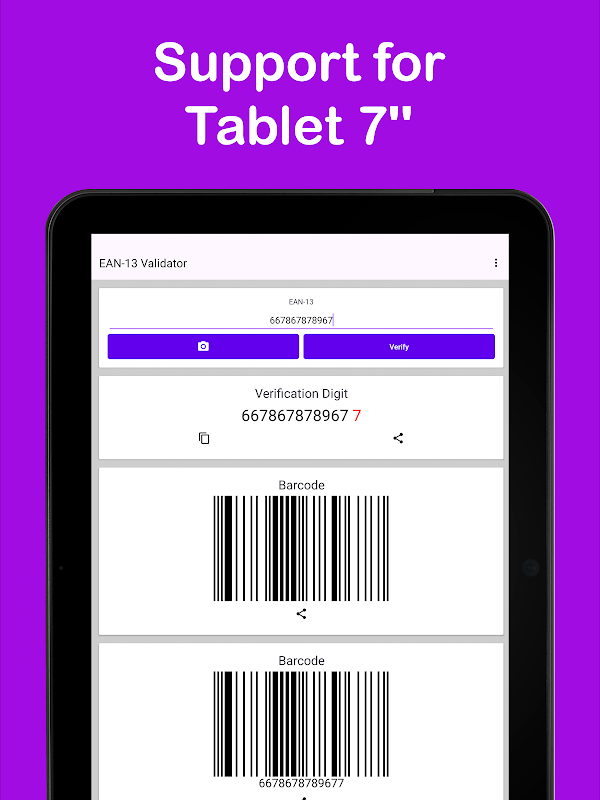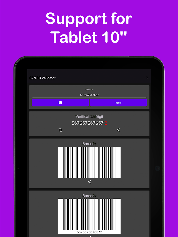 The application to verify the barcode is very easy to use, simply enter your EAN-13 barcode (12 digits) and press the "Verify" button to be able to see its information, you will obtain the Verification Digit (Highlighted in Red) and you can copy or share it. The Bar Code corresponding to your EAN-13 barcode will also be generated, which you can easily share.