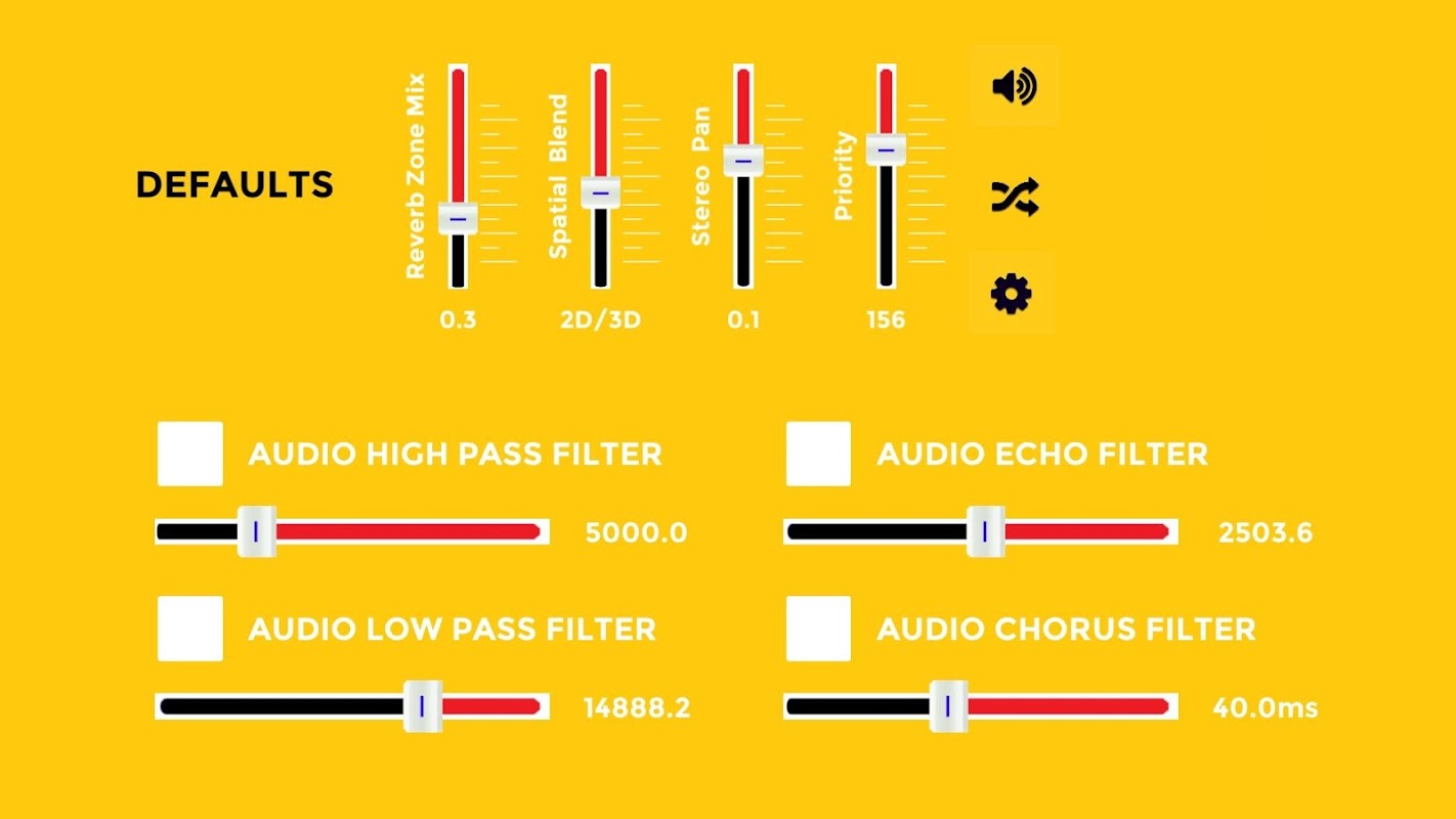 - Control in the volume, pitch, sensitivity, stereo pan, spatial blend 2D/3D...