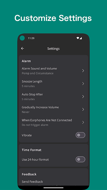 You can select alarm sound from in-app sounds, music files, or system sounds such as ringtones.