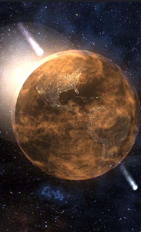Incredible view of the third planet from the sun. Change of day and night, in the east wake up the sunrise, in the west everything is plunged into night lights. The moving clouds in the circle of the planet are poured, collected in one place and dissolve in another. A swarm of artificial satellites enveloped the earth. Periodically fly comets that threaten the planet.