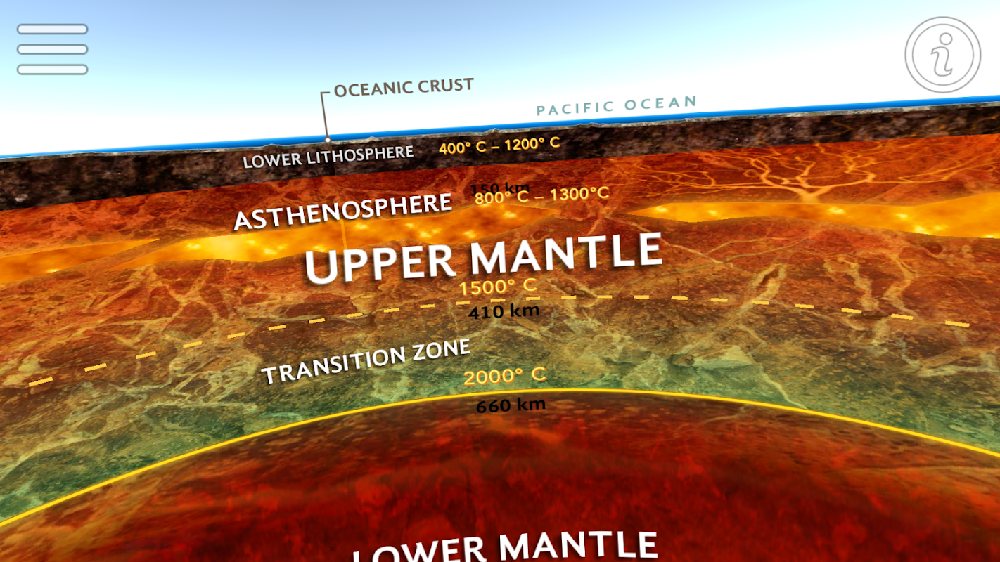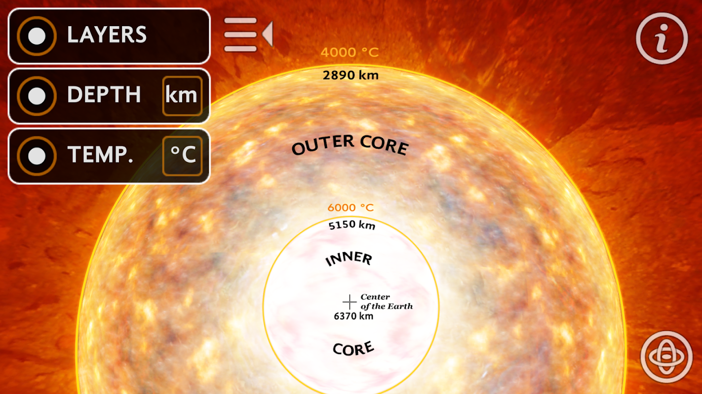 Earth's Core shows the inner mechanics of our planet. Just point with your mobile to the center of the Earth and experience a deep look inside our planet. Right beneath your feet, thousands kilometres deep, lies a giant ball of molten iron as hot as the surface of the sun!