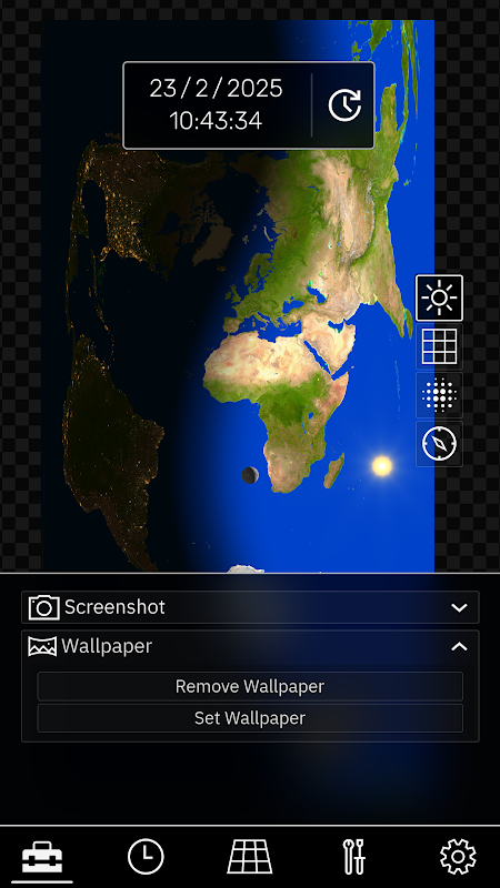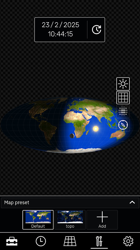 - Time Control: Adjust the time to observe the dynamic interaction of sunlight with Earth’s surface across all projections.