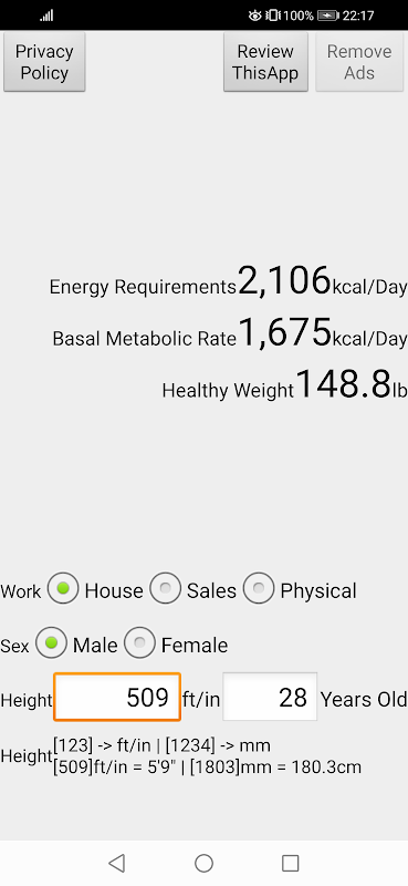 A simple calorie calculation free app that calculates standard weight (BMI = 22) by entering height, energy requirement (kcal) by selecting work and gender, and basal metabolic rate (kcal) by entering age. Appropriate calorie restriction for people with high cholesterol and those who want to manage their weight.