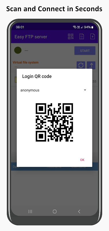 Instantly generate a QR code for quick access to your FTP server. No more manual entries—just scan and start sharing files effortlessly!