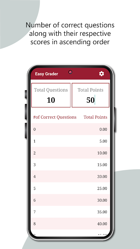Simplify your grading process with our top-rated grading app, designed specifically for teachers and professors. With our intuitive grade tracker, grading papers and tests is as easy as a few taps on your smartphone. Just enter the number of questions and the total points, and our app will instantly generate a clear, easy-to-read grade chart tailored to your needs.