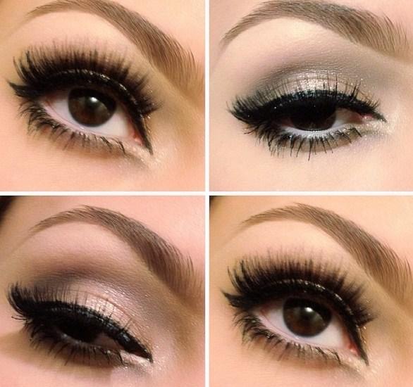 For the eyes, start with the warm-toned dark brown eye pencil. Blend into the upper lashes and smudge with your eyeshadow brush.