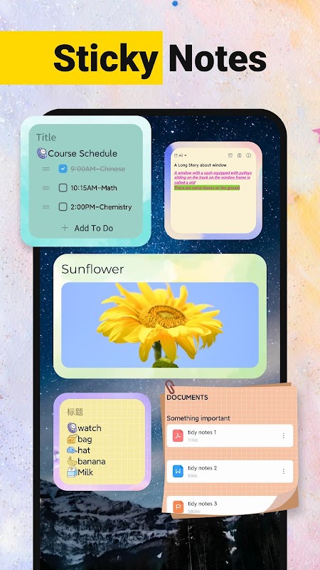 There are various color note widget themes for you to present your tasks when you open the phone. You can access your notes conveniently.