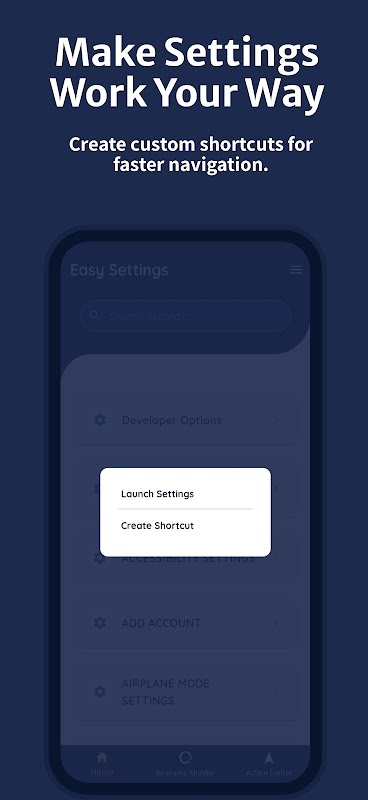 Easy Settings is a simple and powerful app that puts all your device settings in one place. Instead of searching through different menus, you can quickly access and control everything from one screen. You can go to any setting with just a tap. Easy Settings also lets you create shortcuts for your favorite settings or apps, so you can reach them even faster. It’s perfect for anyone who wants to save time and make their phone easier to use. The app also includes a resource monitor that shows your phone’s real-time CPU, RAM usage, and battery status, helping you keep track of performance. The app is lightweight, fast, and works smoothly on most Android phones. No technical skills are needed—just install and start using it right away. Easy Settings is great for everyday users and also useful for advanced users who want more control. The clean design makes everything easy to find and use. Whether you want to adjust brightness, volume or turn on airplane mode in action centre or check system usage in resource monitoring tab, Easy Settings makes it easy. It’s a smart way to manage your phone better and faster. Download Easy Settings today and take control of your phone with ease!