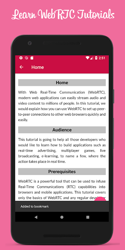 "Do you find difficulty in learning WebRTC? If so, you find the right application to learn WebRTC This app helps you learn WebRTC from basic to advanced. All tutorials are presented in a coherent and clear way for you to facilitate your learning. Here are some features in this app: