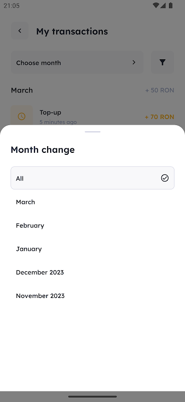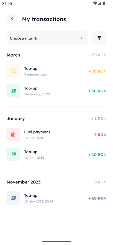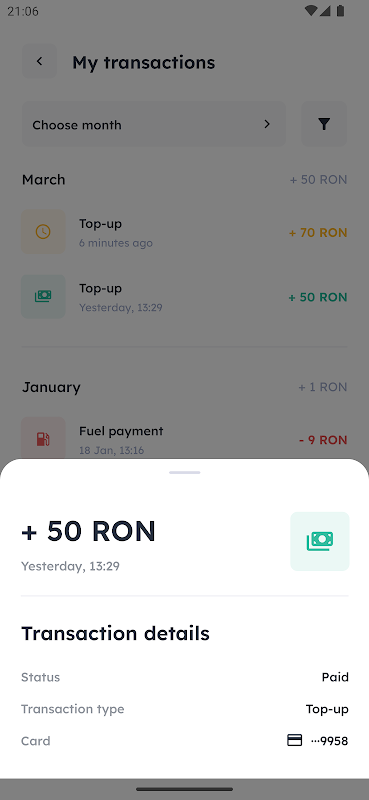 You have access to all transactions made at Rompetrol gas stations and card top-ups made in the application.
