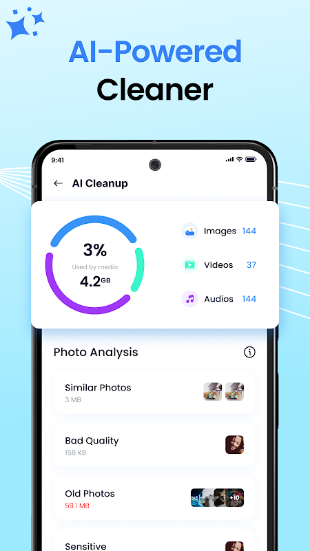 Our intelligent AI Cache Cleaner helps you scan your device to find and clear junk files, cache, and unnecessary data. AI Cleanup identifies duplicate photos, similar images, blurry or low-quality pictures, old screenshots, and large files taking up storage. With just a tap, you can sort, review, and clean your phone easily.