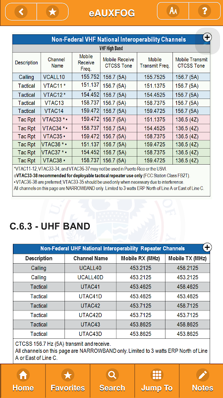eAUXFOG mobile app is an electronic reference of the Auxiliary Communications Field Operations Guide. The eAUXFOG is a technical reference for emergency communications planning and for radio technicians responsible for radios that will be used in disaster response. It includes rules and regulations and other interoperability channels, tables of frequencies and standard channel names, and other reference material.