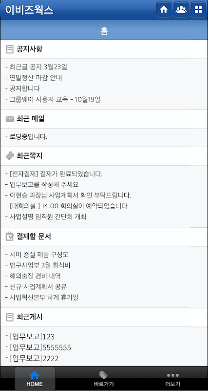 -You can freely use the main services provided by Ebizworks, such as e-mail, electronic payment, schedule management, bulletin board, and employee address book, in a mobile environment, so you can check and process work without restrictions on time and place.