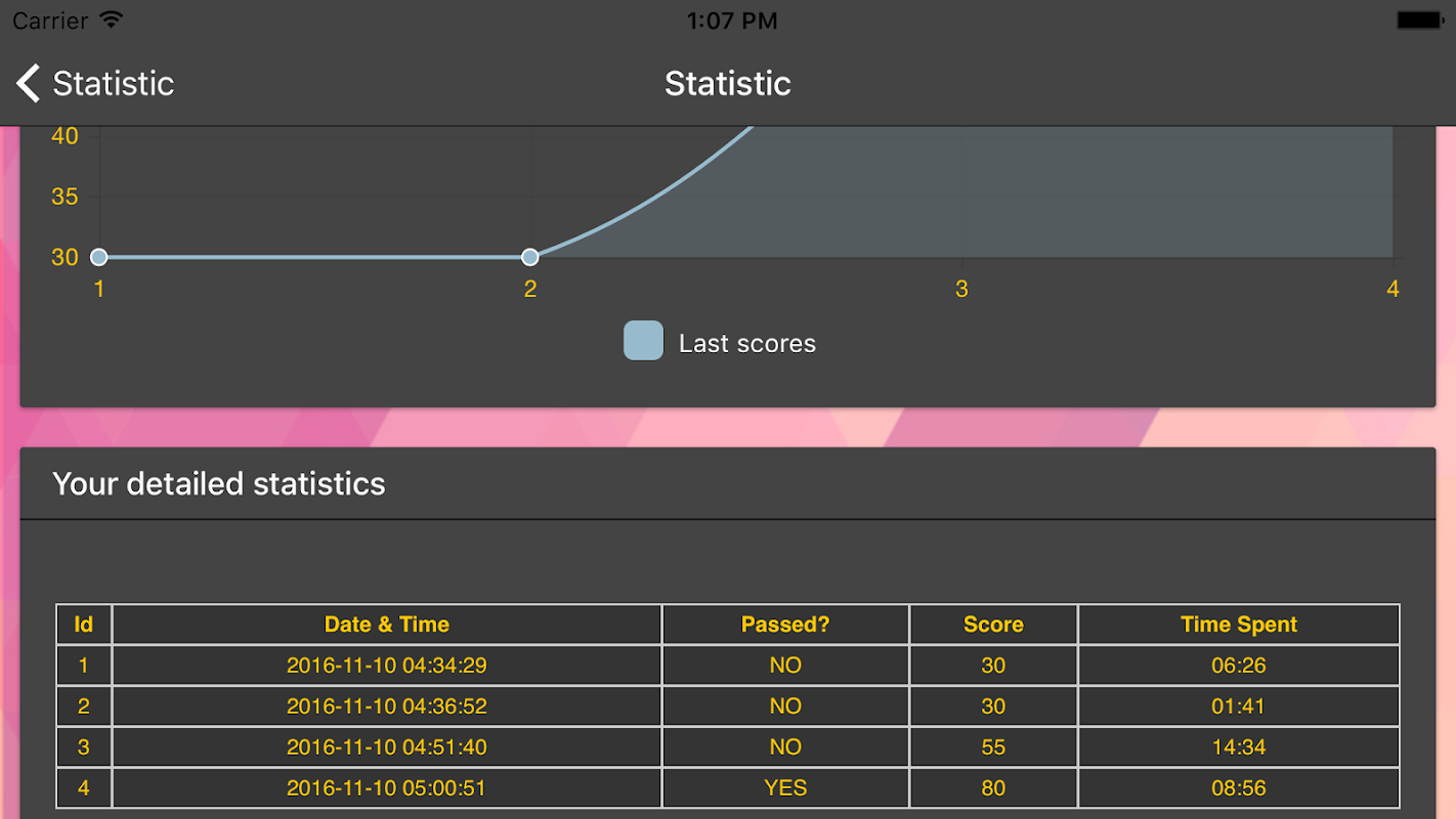 All of the records when taking exams or quizzes are stored automatically. This feature includes development graphic of the quiz score from time to time for each ECG / EKG quiz category.