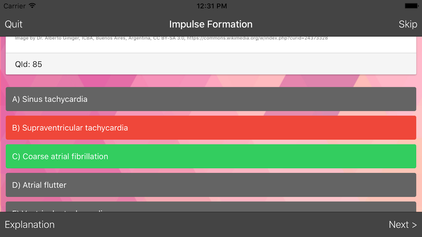 There is specific interpretation for each question in ECG / EKG quiz. The explanation given is simple, precise, and relevant to the case to make it easier to memorize. However, the explanation feature is only available in pro version.