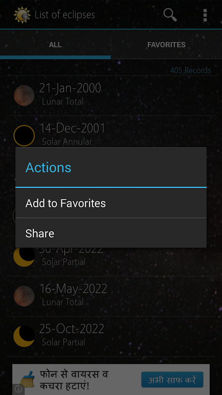 This android app displays the list of all solar and lunar eclipses falling within the period of 2000 to 2099