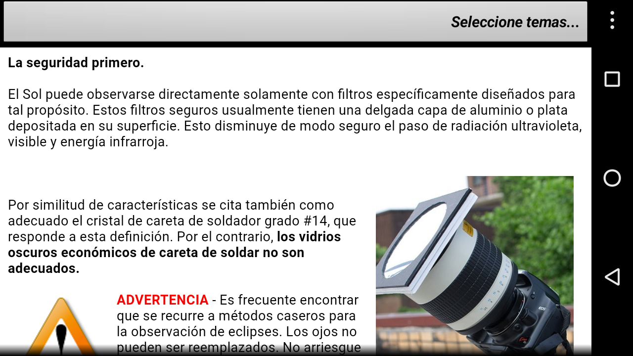 Se incorpora nueva sección con recomendaciones sobre uso seguro de telescopios y binoculares para proyección.