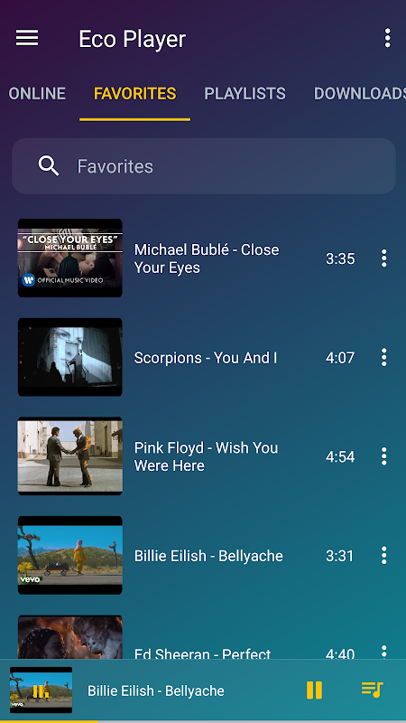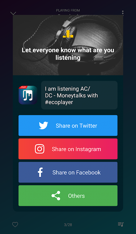 Eco Player is the best music player for Android users.It has a huge variety of features and modern design. Eco Player takes less memory and it gives you the opportunity of offline music.