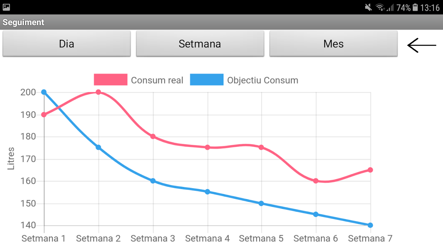 · Per a obtenir una informació més detallada hem incorporat uns gràfics que indiquen el que gastes per dia, per setmana i per mes.