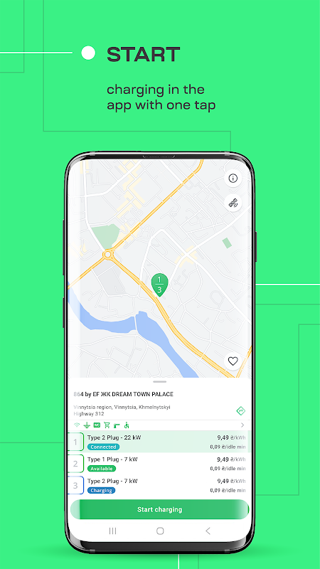 1. Find the nearest EV charging station by speed (7 kW, 9 kW, 22 kW, 50 kW) and connector type (ССS 1, CCS2, Type 1, Type 2 Plug, Type 2 Socket, CHAdeMO, GB/T DC, GB/T AC).