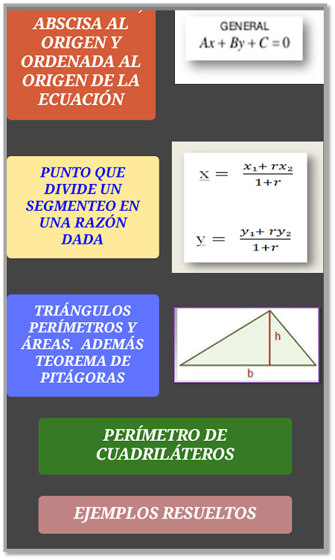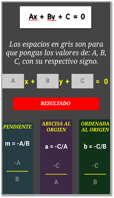 ES UNA CALCULADORA QUE AYUDA A COMPROBAR LOS RESULTADOS DE LOS EJERCICIOS EN GEOMETRÍA ANALÍTICA, PARA ENCONTRAR LA ECUACIÓN DE LA RECTA CON PUNTO PENDIENTE, OTRA QUE PASA POR DOS PUNTOS, OTRA CON ECUACIÓN GENERAL, DISTANCIA, PUNTO MEDIO, PENDIENTE, ÁNGULO DE INCLINACIÓN, ABSCISA AL ORIGEN, ORDENADA AL ORIGEN, PUNTO QUE DIVIDE UN SEGMENTO EN UNA RAZÓN DADA, PERÍMETRO Y ÁREA DE CUALQUIER TRIÁNGULO, TEOREMA DE PITÁGORAS, PERÍMETRO DE CUADRILÁTEROS Y HAY EJEMPLOS RESUELTOS DE ALGUNOS EJERCICIOS.