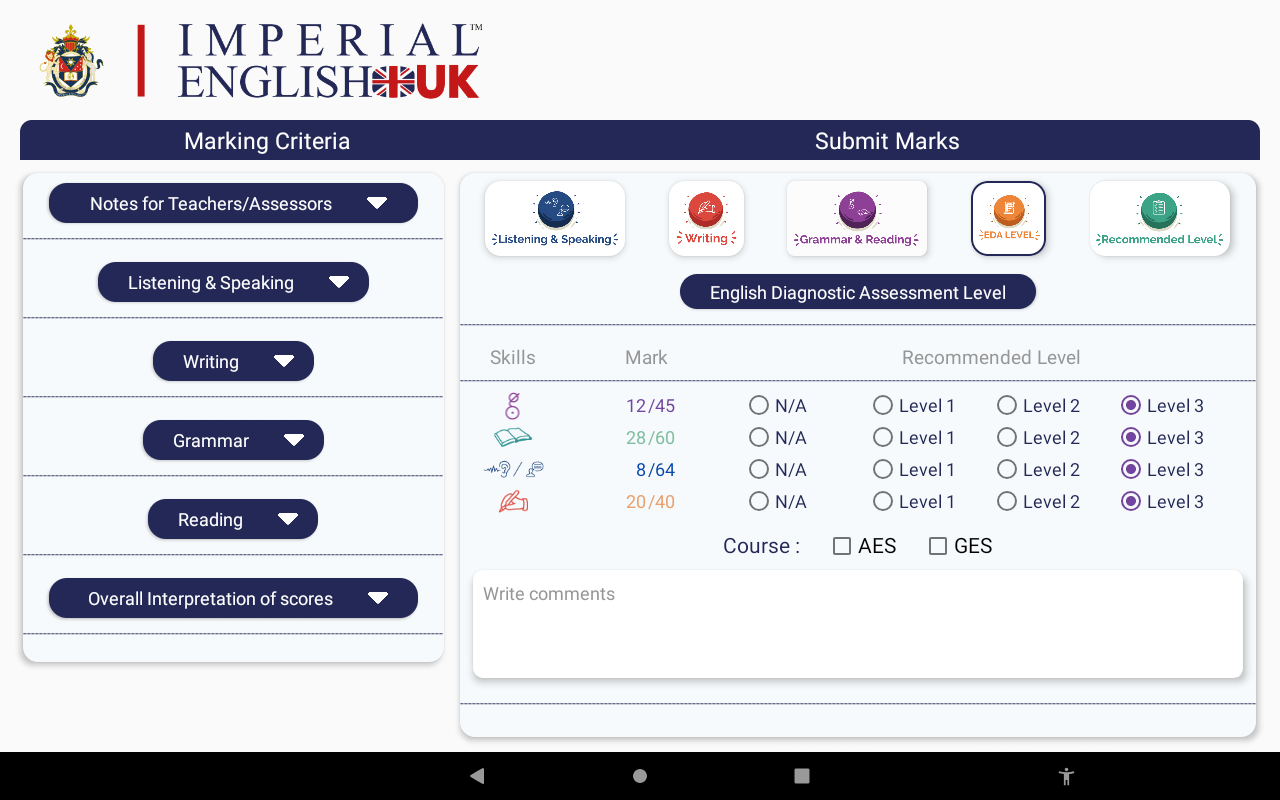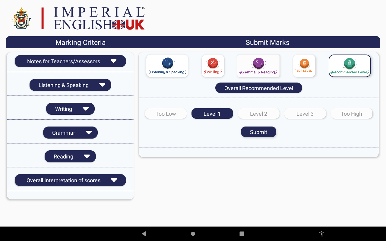 The English Diagnostic Assessment Teacher App enables Teachers to mark and assess the students’ performance for them to assign them onto a suitable course & begin their studies at the Imperial English Academy!