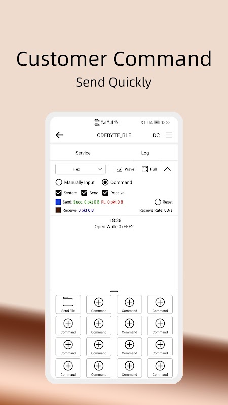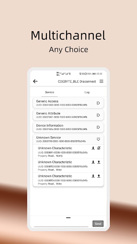 Communication: The tree structure lists all services and feature UUIDs and feature attributes, supports feature reading and writing, Notification on and off, Indication on and off, supports multiple encoding methods, such as UTF-8, GBK, or directly use sixteen Hexadecimal, support periodic sending of messages