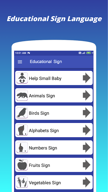 Educational Sign Language App have been organized into various sections which start with basics such as alphabets, Animals and numbers to the advanced level.