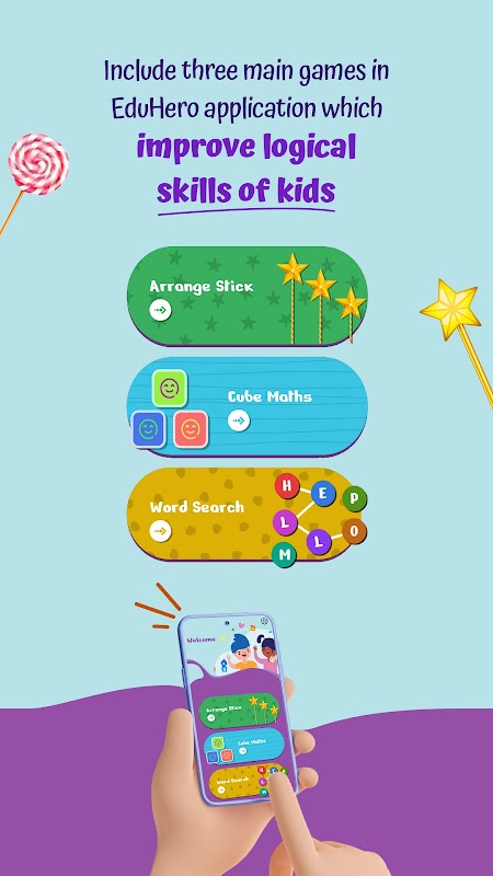 Include three main games in EduHero application which improve logical skills of kids.