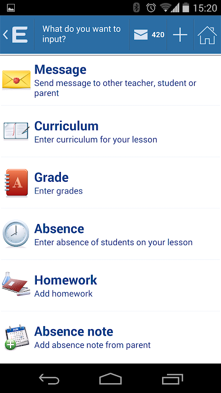 Input absent students. Class teachers can also input absence notes or simply allow parents to send electronic absence notes directly from their mobile phones.