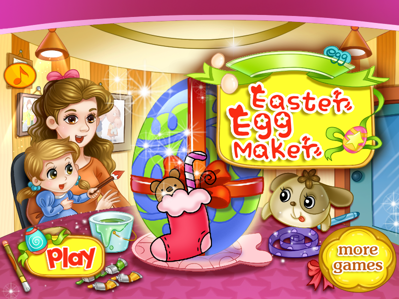 Your child is the hero of a story that will help you discover some of the Easter habits which is coming soon. The child is invited with his family in Bunny`s workshop where they will prepare eggs, bread and cake for the Easter celebration.The child finds out the meanings of the colours used to paint the eggs, and parents will be drawn into the holiday spirit . Along with his mother, he has to prepare Easter meal that consists of haggis , red eggs , cake , bread . Each year, the rabbit brings gifts to obidient, hardworking and kind children. Chicken sits quietly in the cage and waits to be fed with grain . Hit chicken with the stick so it makes an egg. Give her food in the bowl and when it is out of the cage quickly take the egg . Together with the mother , take the egg in the kitchen and put it to boil. Mother starts cooker , puts water to boil then puts the egg . After the egg is cooked, it is ready for painting . You can choose from a wide range of colors and decorations for the Easter egg . Paint it in your favorite color and show to all your friends what a beautiful Easter egg you have prepared.