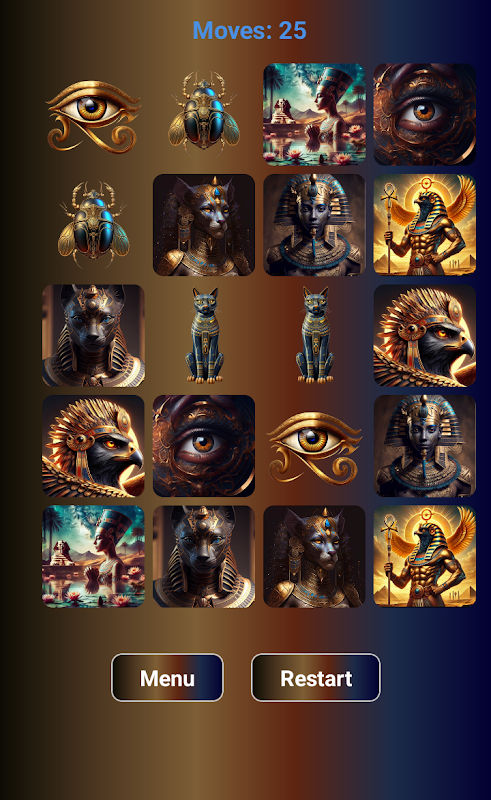 Egypt themed memory game, choose one game and earn stars that will help you play in level mode. The game keeps the best achievement in single game and the maximum level reached when playing in level mode.
