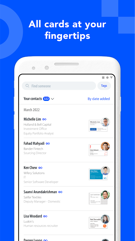 Search by name, company name, department, or position, and use full-text search of memos and grouping by tags, to quickly find the information you need after scanning biz cards.