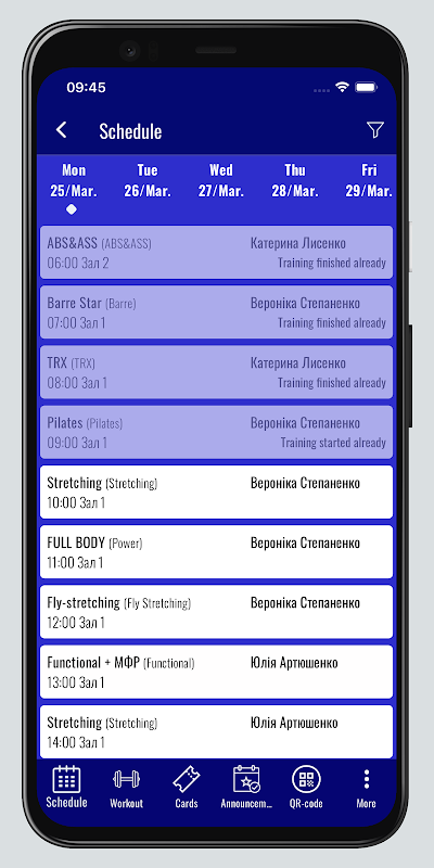 1. Viewing the schedule: Do not miss a single training session! A convenient view of the schedule allows you to plan your classes in advance and be aware of all the events in your sports club.