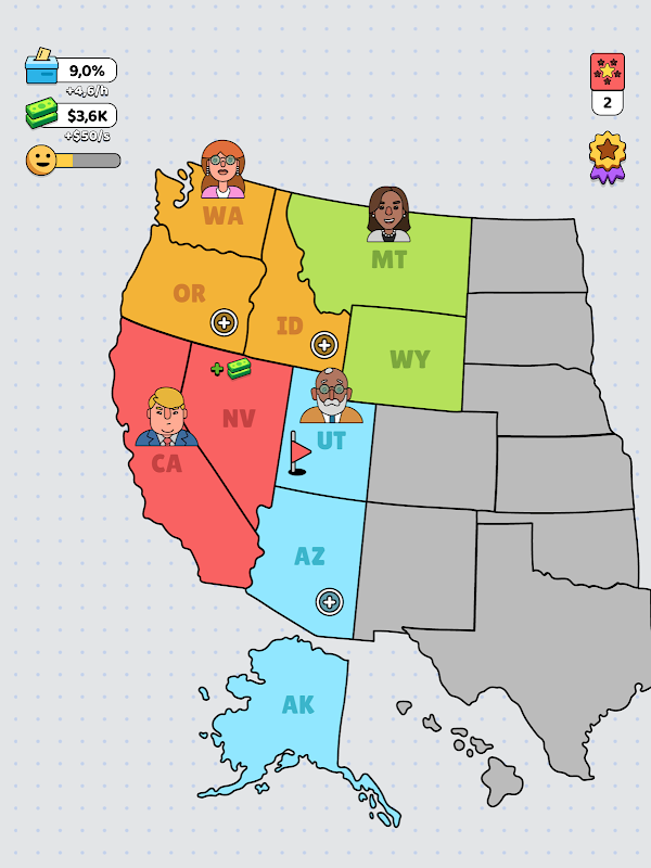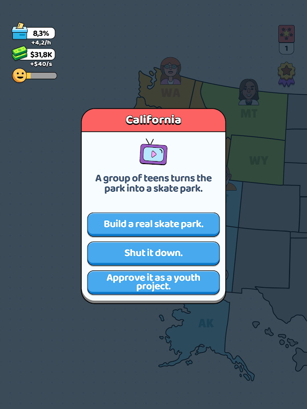 Step into the world of politics with this immersive election simulation game! Choose from 7 unique candidates and start your campaign with control over just one state. As you expand your influence, run for office in other states and answer critical questions that shape your vote percentage and campaign funds. Every decision matters as you navigate the complex landscape of American politics. Can you rise to become the nation's leader? Strategize, answer questions wisely, and watch your influence grow!