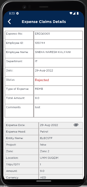 The app also has a rejection cycle by both line manager and final approver. If rejected the claim goes back to base employee for correction and updating with resubmission to approval work flow chain.