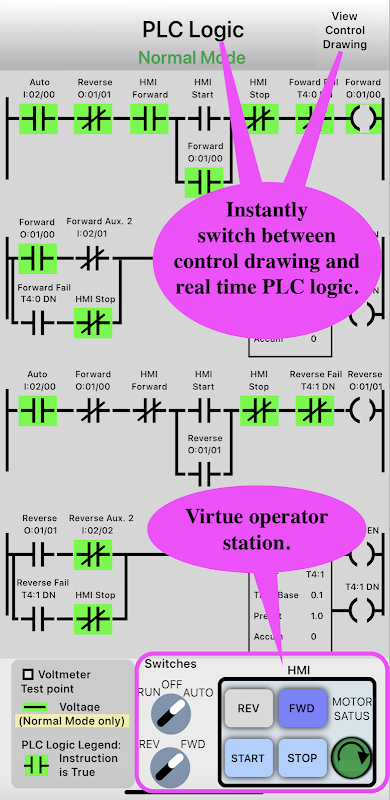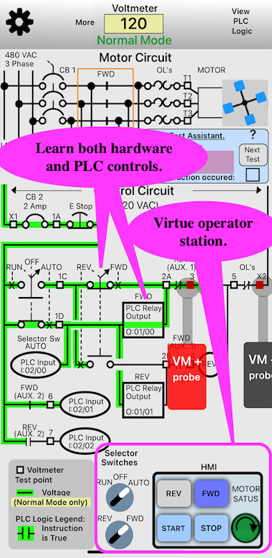 This app has 17 different electrical problems that are randomly selected to provide a fun and challenging learning experience. It is certain to help you become more proficient in troubleshooting with a voltmeter. The motor starter is animated so that you can SEE the different contact configurations between forward and reverse. Another unique feature of this app is the ability to instantly switch back and forth between the control schematic and the real time PLC logic. There is also a "Troubleshooting Assistant" to help test the control circuit and find the problems.