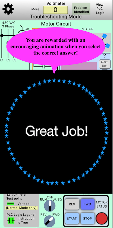 After the you understand how the motor starter works in the various control modes, you can check your troubleshooting skills by going to "Settings" (touch the 'More' button (at the top of the app) and then the gear icon) and selecting troubleshooting mode. Touch the "Arrow Back" icon to return to the control schematic. You will notice that the screen background has turned a light green, indicating that it is in troubleshooting mode and has a problem that needs to be found. Use the "Troubleshooting assistant" at the top, right side of the control schematic to help set the operator switches for testing. Use the voltmeter probes and PLC logic screen to identify the problem. Once you believe that you have identified the problem, touch "Problem Identified" button at the top of the app. A list of possible problems will appear. If you cannot determine the problem, at the bottom of the list, there is an item to provide the answer. If you desire to put the control system back in to normal (Non Troubleshooting Mode - No electrical problems) to learn more about how it is suppose to work, go to the settings section and unselect "Troubleshooting Mode".