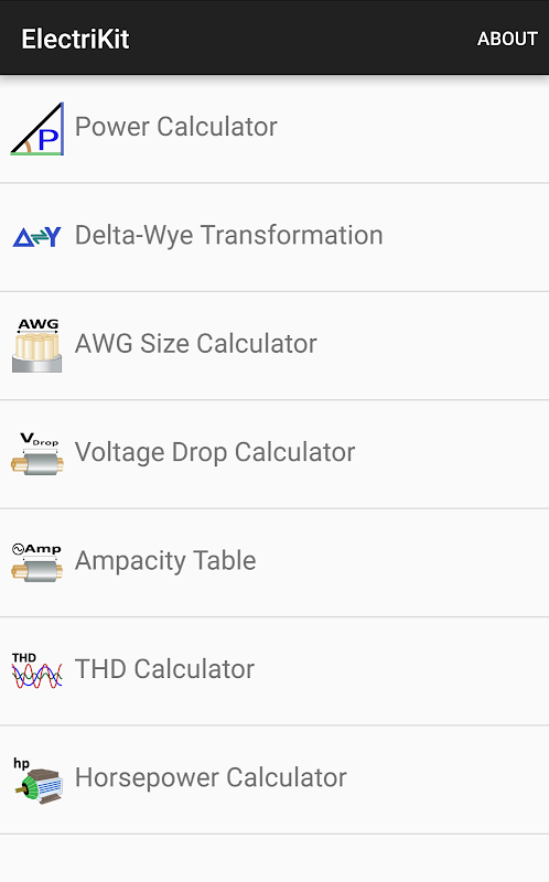 ElectriKit is a helpful tool for electricians, technicians, engineers, students, hobbyists, and anyone dealing with electrical power. The app provides several power-related calculator functions and can also be used as a quick reference for electric power formulas and standard NEC (National Electric Code) tables. Simply input your parameters in the intuitive user interface and let ElectriKit do all the complex calculations for you!