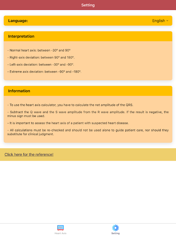 Disclaimer: all calculations must be re-checked and should not be used alone to guide patient care, nor should they substitute for clinical judgment. Calculations in this “Electrocardiogram (ECG) Rhythm App: Heart Axis” app might be different with your local practice. Consult to expert doctor whenever necessary.