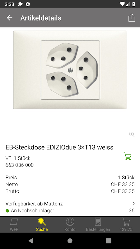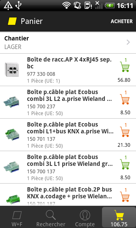 Même dans les endroits sans connexion internet, vous avez accès à tous nos articles sur l'app. Par exemple, vous pouvez placer les articles souhaités dans le panier d'achat, par ex. dans un sous-sol ou sur un chantier de construction éloigné - et envoyer la commande dès que vous disposez à nouveau d’une connexion.