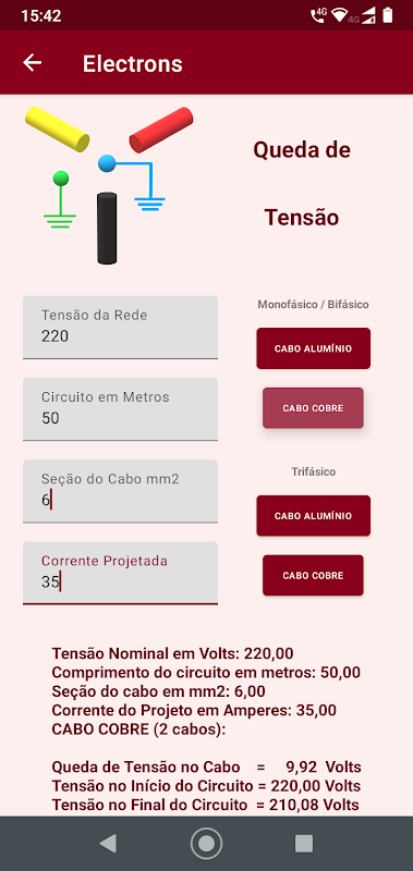 Calculates neutral current, PF, current, voltage, resistance, voltage drop.