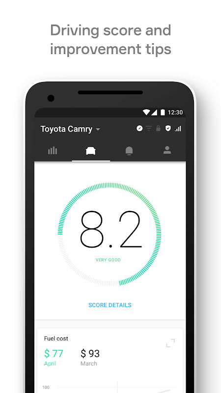 • Score and statistics: Each trip generates a score that is combined with the overall driving score. Statistics visually show how much you spend, drive and consume fuel.