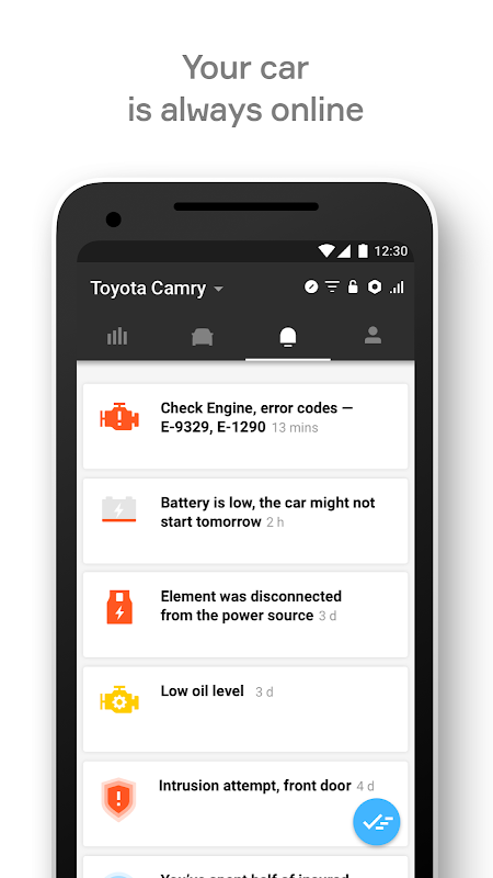 • Remote Diagnostics: Real-time information of the fuel level, battery level, car temperature and DTC codes.