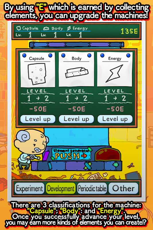 By using "E" which is earned by collecting elements, you can upgrade the machines!