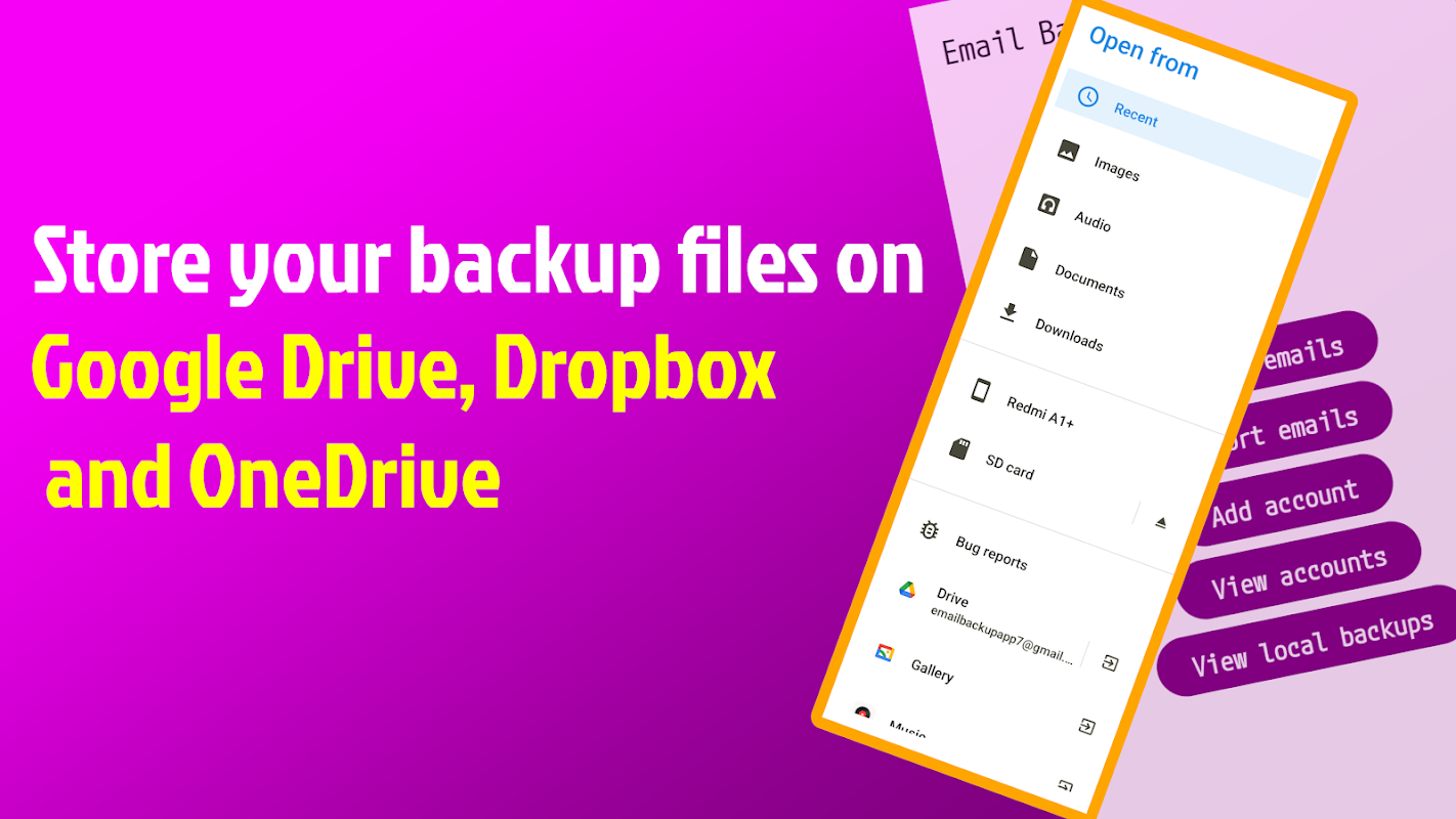 If you have Google Drive, Dropbox, or OneDrive installed on your device, you can select backup files from your cloud drives to import emails. Additionally, you can store your exported email data in the cloud drive. Currently, it supports only the above three cloud services.