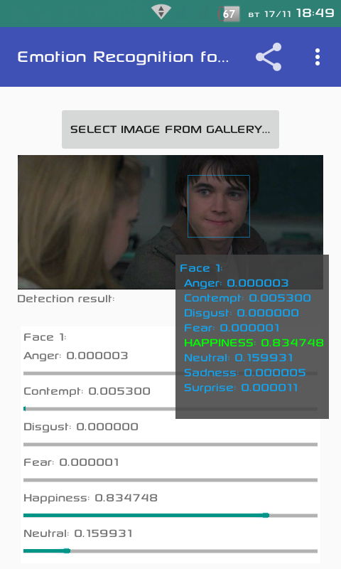Application show you emotion rating from 0 to 1 after analysing faces on photo